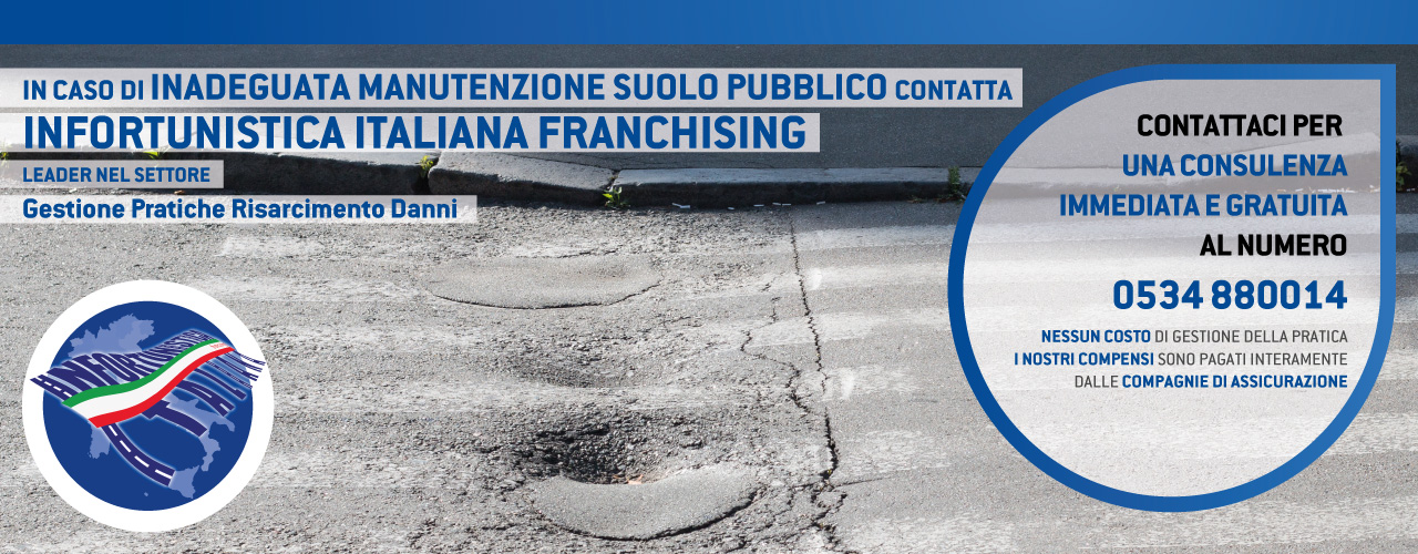Infortunistica Italiana Franchising valutato gratuitamenteil presupposto di causa e effetto tra l'anomalia del manto stradale ed il danno subito dal cittadino, vi assisterà completamente grazie all'ausilio di professionisti legali e medici in convenzione sino alla vostra completa guarigione e ricordiamo che l'onorario dello studio verrà riconosciuto solo a buon esito della pratica ed in diversi casi verrà pagato totalmente dall'impresa di assicurazione.